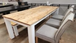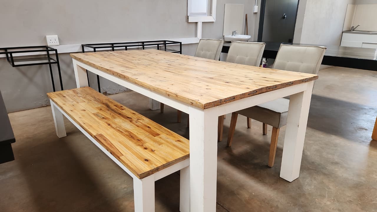 Pre-owned , Set is in a fair condition table and the bench need some work but the chairs are in excellent condition.