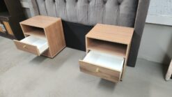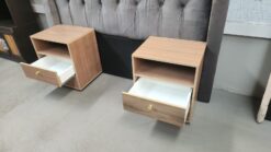 Grey queen buttoned headboard with 2 super wood pedestals.